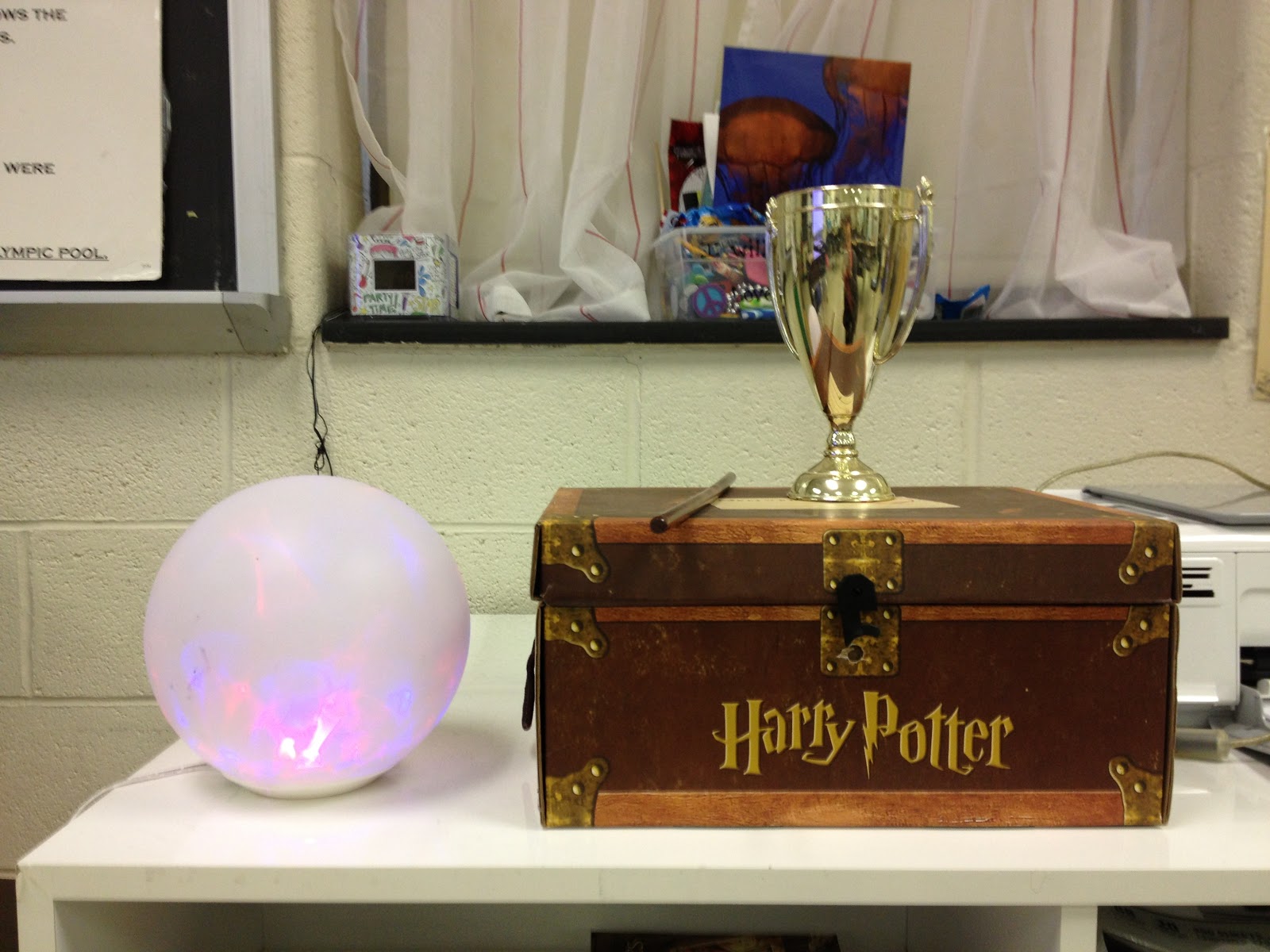 Before I knew it, I had a cool nightlight that resembled Professor Trelawney's crystal ball, an old wooden rod that looked a lot like a wand, a gilded plastic cup from the top of one of my son's trophies that I knew would serve nicely as a Triwizard Cup, and a plan for resurrecting the "house points" jars I had used in class a couple of years ago for behavior management.